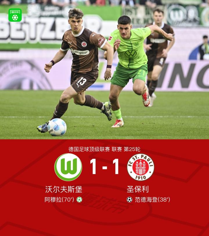 在北京时间3月8日进行的德国足球甲级联赛第25轮中,沃尔夫斯堡主场迎战圣保利。比赛开始后,双方球队展开激烈的对攻,争夺胜利的决心可见一斑。在比赛进行到第38分钟时,圣保利球员杰克逊-欧文在一次快速反击中成功助攻给范德海登,后者冷静地将球送入对手球门,打破了比赛的僵局,为客队取得了领先。